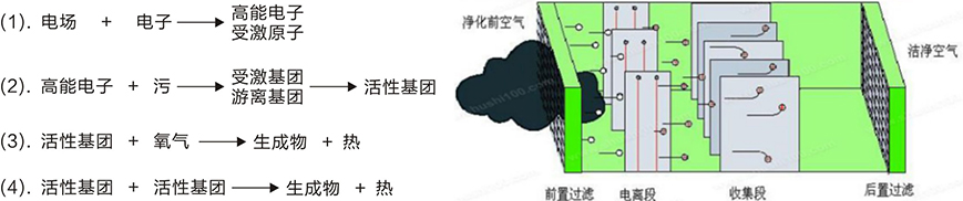 從以上反應過程可以看出,電子先從電場獲得能量,通過激發或電離將能量轉移到污染物分子中去,那些獲得能量的污染物分子被激發,同時有部分分子被電離,從而成為活性基團。然后這些活性基團與氧氣、活性基團與活性基團之間相互碰撞后生成穩定產物和熱。