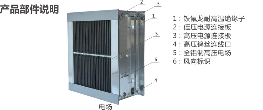 每個收集段由很多數(shù)量的平行板組成,通以高壓直流電(極性與電離器一致,但電壓減半)以形成電場,帶電微粒被接地板吸引的同時也受到帶電板的驅(qū)趕。正因如此,當(dāng)氣流中含有帶電微粒時,可以被高效去除。